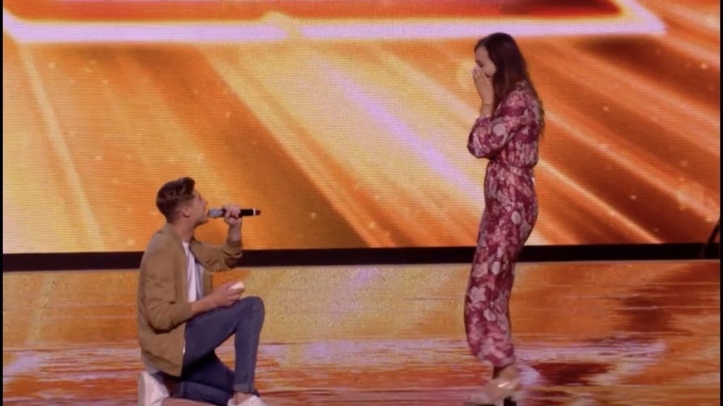 On stage at boot camp, Sam Black, a contestant on X Factor, proposed to his girlfriend Emma.